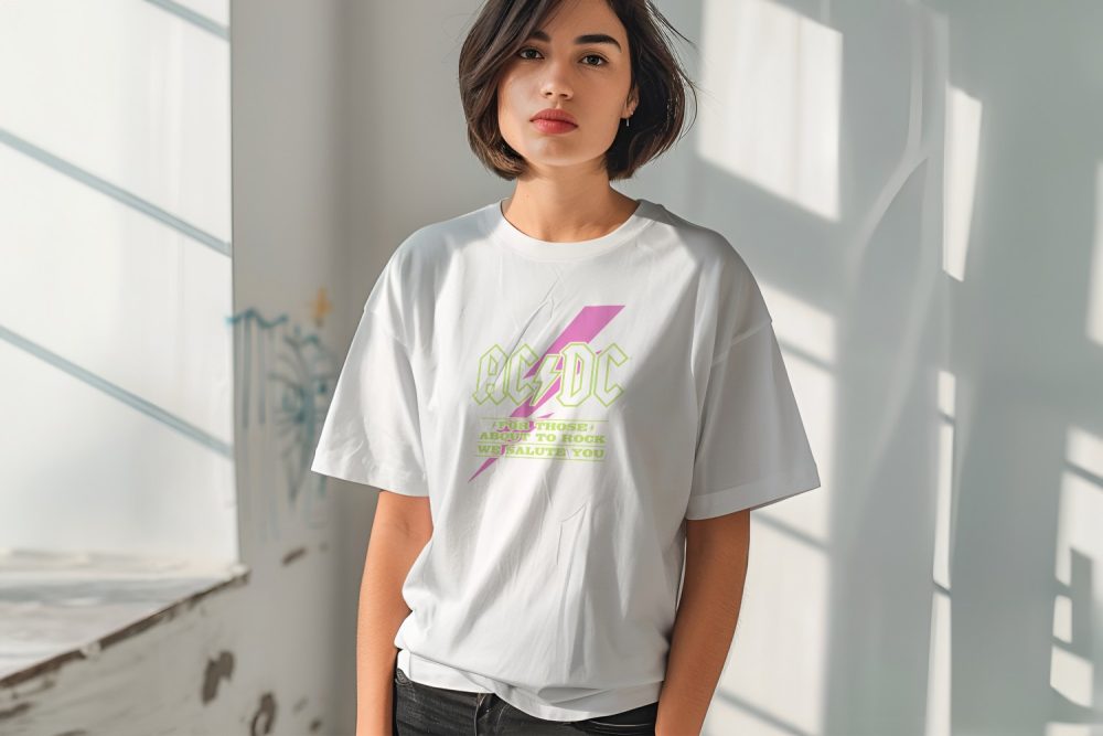T-shirt oversize coton bio femme ACDC avec un design de ACDC For those About To Rock rose