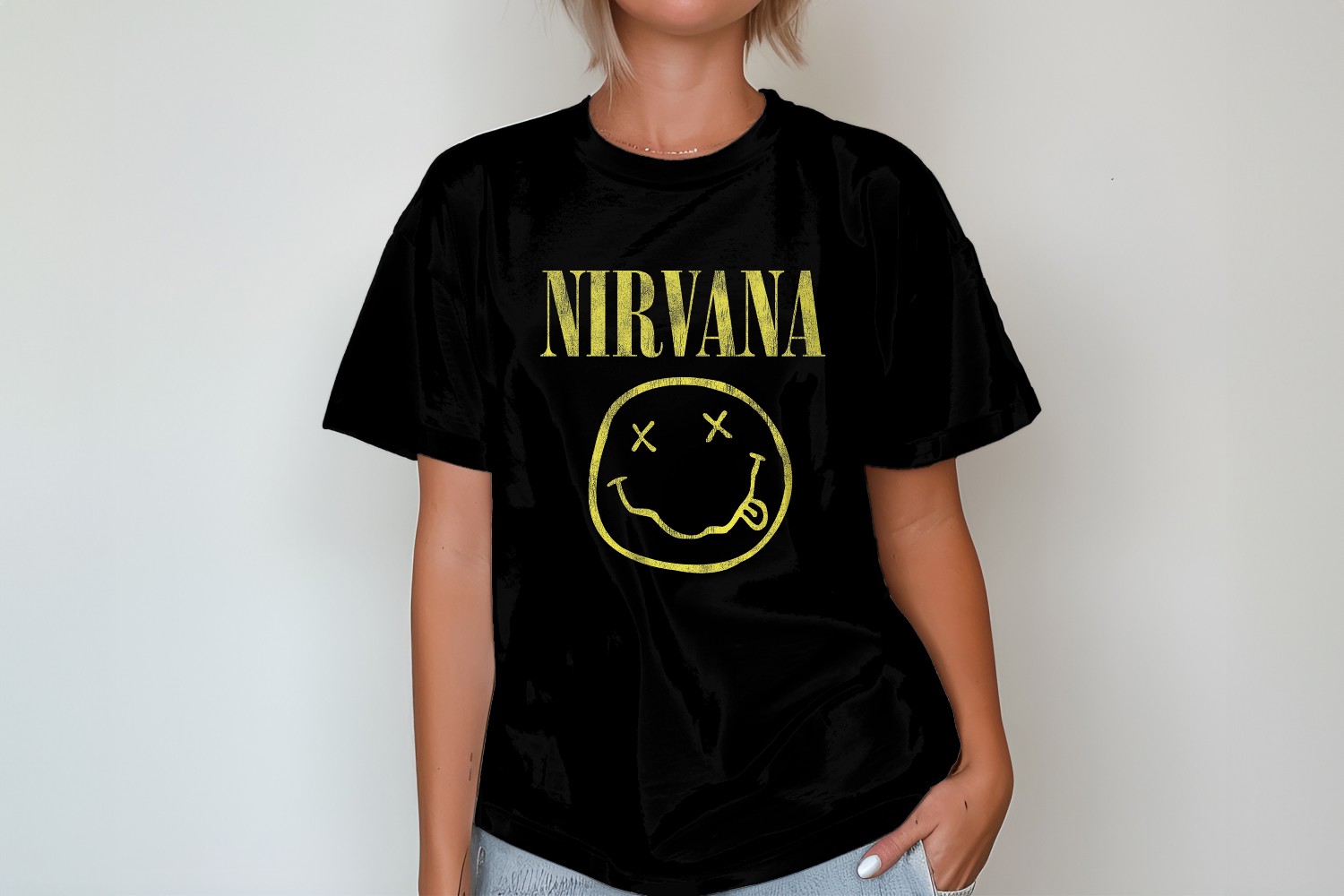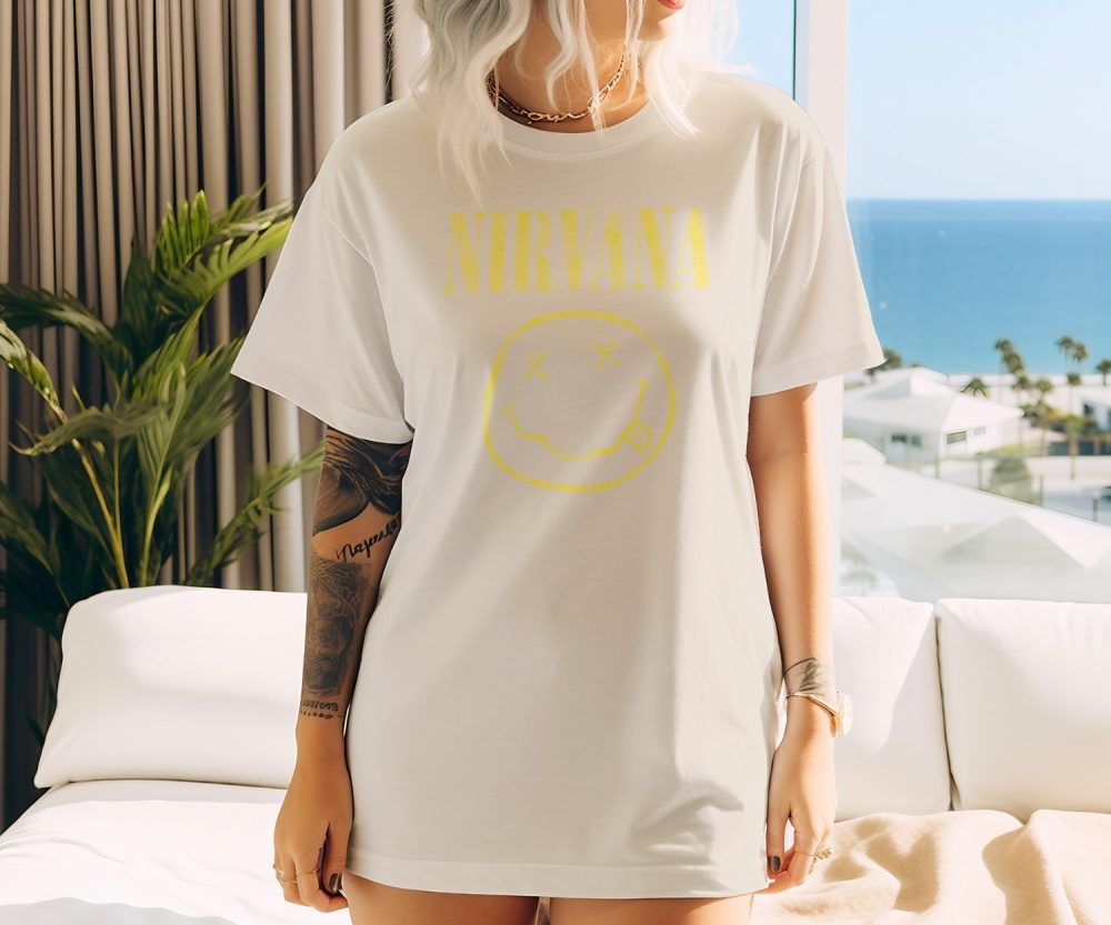 T-shirt oversize coton bio femme Nirvana avec un design de Nirvana Smiley jaune